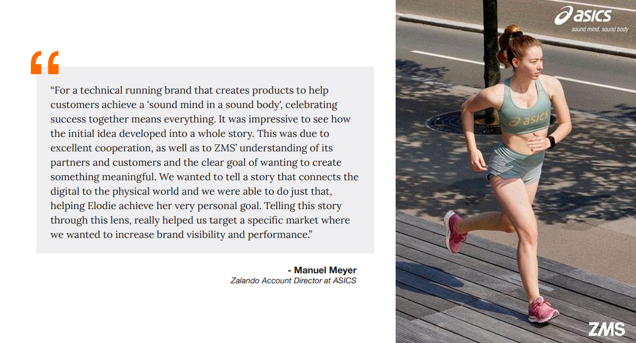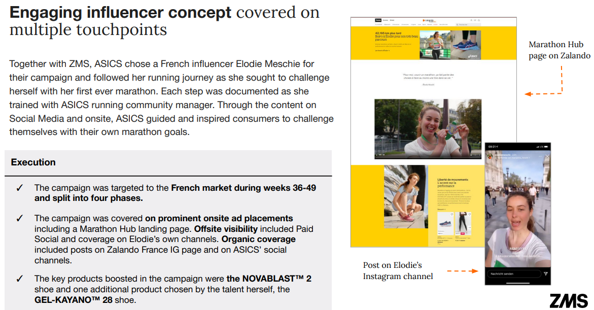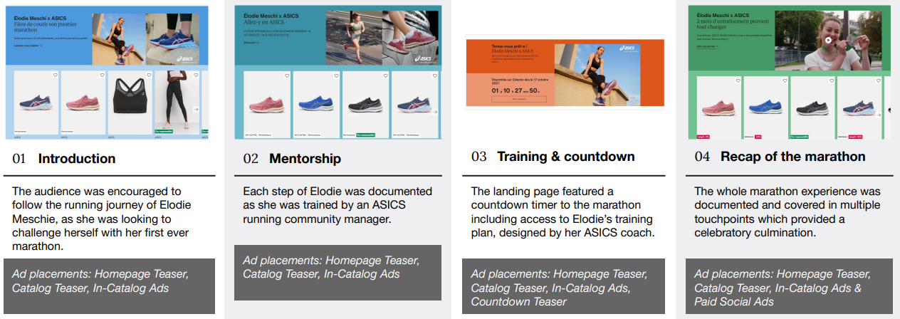 Together with Zalando’s integrated creative agency (ZMS), ASICS chose French influencer Elodie Meschie for their campaign in collaboration with ZMS, Zalando’s integrated creative agency. The concept: following and supporting her running journey as she sought to challenge herself with her first ever marathon. Each step was documented along the way, as she trained with ASICS running community manager. Through the content on Social Media and onsite, ASICS guided and inspired consumers to challenge themselves with their own marathon goals. My role was to create copy for each asset, embracing Asics modern and uplifting tone of voice. The brand achieved high visibility, consideration, and increase in market share within their target audience of French female runners.